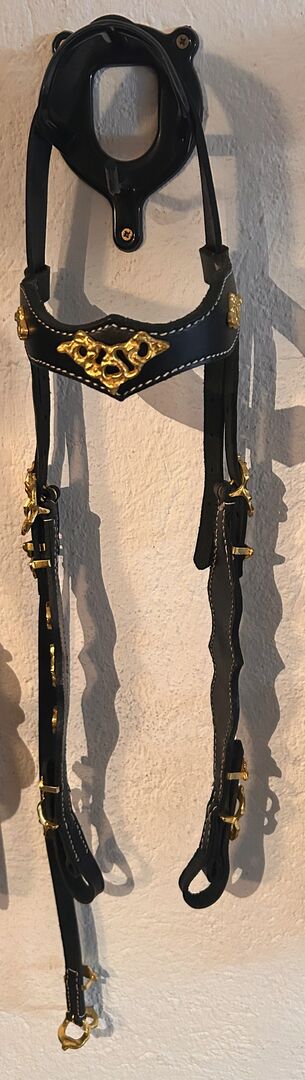 Baroque bridle - Very nice baroque bridle made of very soft leather, black, gold with white decorative stitching. Baroque buckles. 1 pair of reins included. For horses with narrow foreheads (!) and long heads.