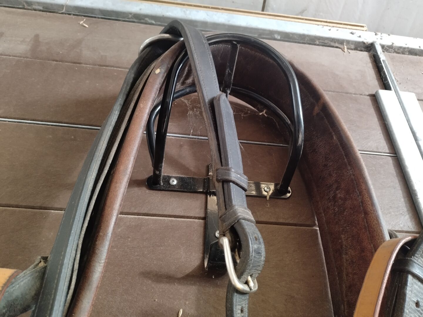 Breastplate harness 2-horse - Breastplate harness, 2-horse, complete with rear harness and leads. Very old but still in good condition. Very sturdy and heavy design. Suitable for warmbloods or coldbloods (size full).