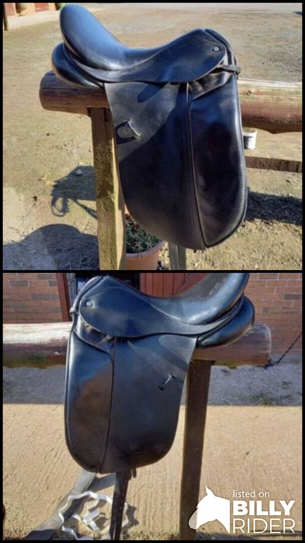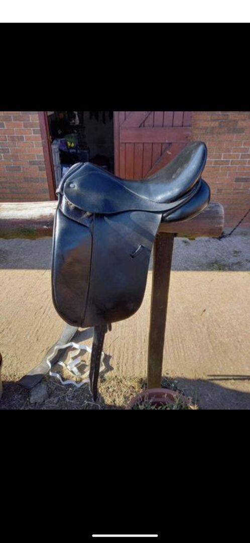 Dressage saddle, 17.5 inch seat. Wide fit but does have a high pommel. Was used on KWPN with high withers. Good condition for old saddle, the seat was reflocked about 3 years ago and not been used much since as my boy retired. Only selling as he has now been PTS.