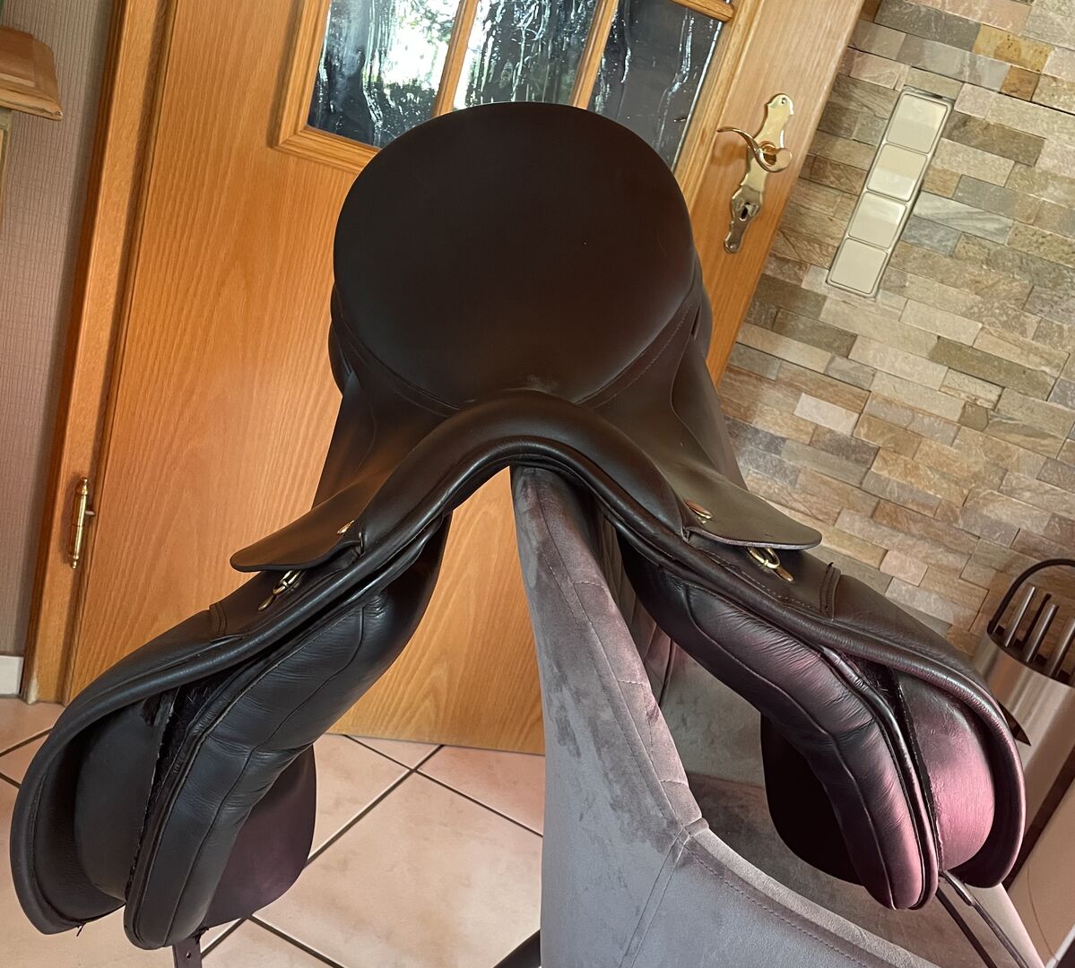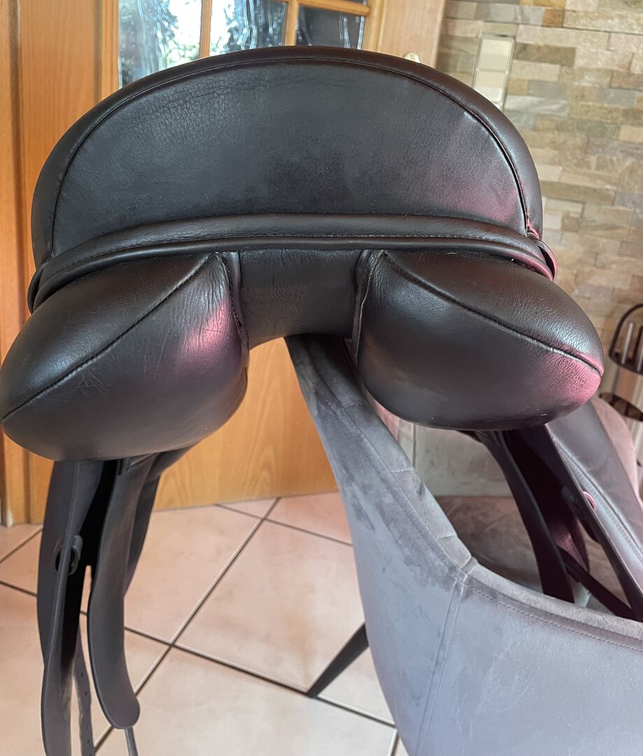 Dressage saddle Kent and Masters 17,7-18 inch - For sale a very well maintained 17.5-18 inch dressage saddle which has always been stored dry in the saddle cupboard in the garage on a rail. Seat area 43 cm, saddle flap 50 cm It was completely re-upholstered approx. 1.5 years ago and is very comfortable. It has been regularly checked by the saddler. Of course there are traces of use where the stirrup leathers were and also in a few other places. But nothing is broken, just the leather is a little dull. There is a small scuff at the back of the saddle There are two Velcro knee rolls, one of which is slightly damaged. It didn't bother me but you can easily buy them again. It has replaceable gullets that you can change yourself with six screws. A yellow gullet plate is currently fitted and there is also an orange and white one. Shipping price is approx. 25€ Paypal possible The saddle can be taken away against deposit of the full purchase price. If you have any questions please contact me