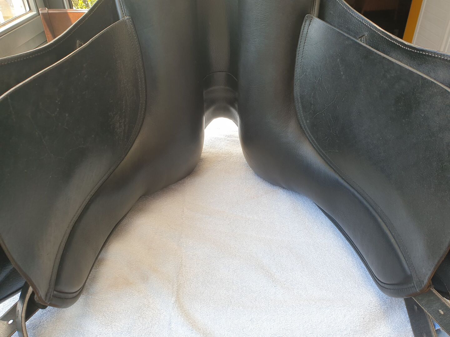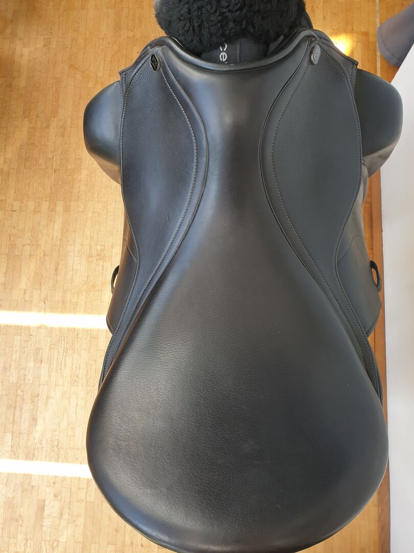 Dressage Saddle PDS Showtime Corto, 18" - PDS Dressage Saddle Showtime, XCH Gullet System, Corto, MW, 18". Condition: "Used". Shipping with DHL package up to 10 kg. Here is a beloved dressage saddle for sale. It has not been used for 4 years and has been stored dry at home during this time. This saddle has not fallen off and has not been in a riding accident. The leather is completely intact and has been regularly cared for, including the last 4 years. Signs of use are mainly in the stirrup strap area. Those who like attached knee blocks will feel at home in this saddle. The XCH Gullet System makes it easy to adjust the gullet plate to the changes of the horse. Furthermore, the contact surface can be padded and adjusted by a saddle maker. Corto means that the saddle surface is slightly shortened (think of French cushions).