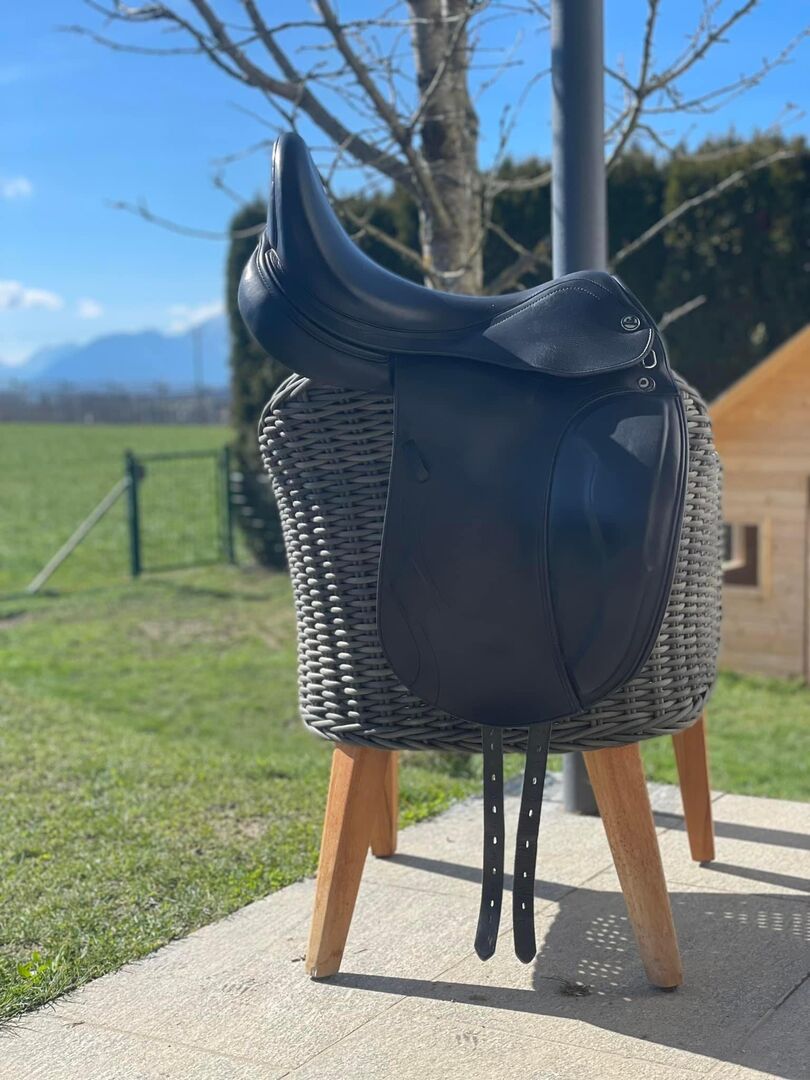 Dressage saddle Prestige - SALE Three-course saddle from Prestige Model 'Philosopy' D seat 17 inch/ gullet width 36 age 03/21 super well maintained 1A condition Saddle tree with innovative CPS concept membranes that specifically dampen stress. The height of the withers is wider than traditional saddles to give more freedom to the withers and the trapezius muscle. By deep seat closeness to the horse without disturbing the movement. the half-moon of the cantle is made of damask leather. Anatomically shaped pommels. 2.300,- Location Salzburg