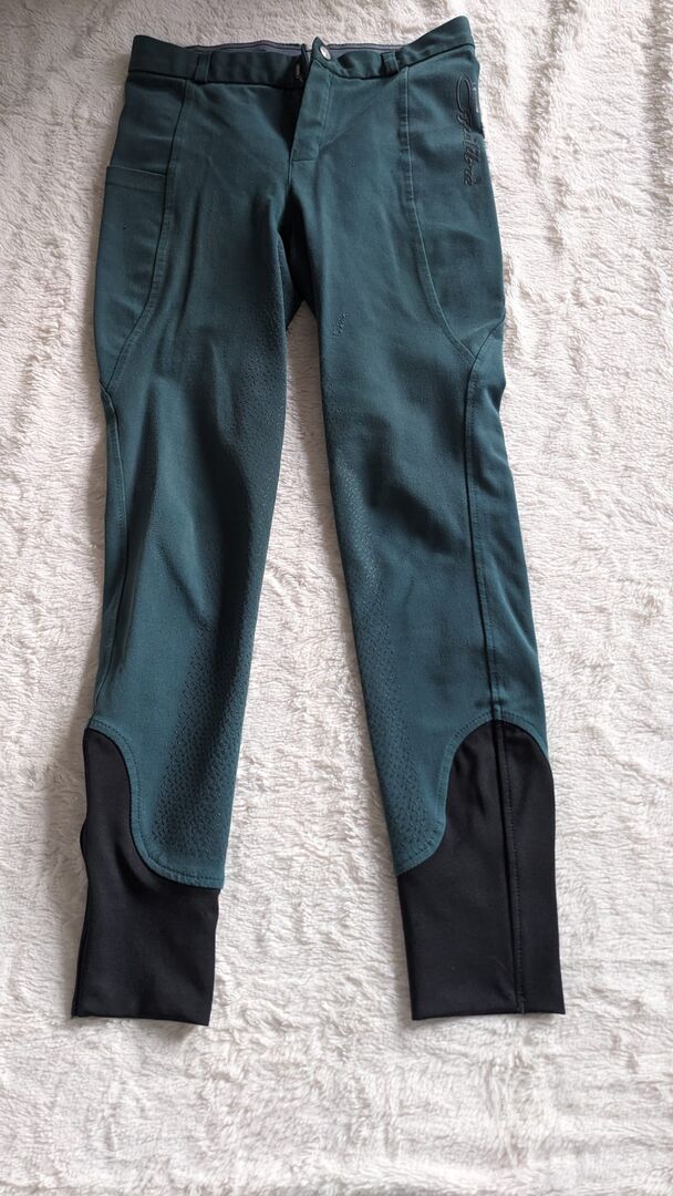 Equilibre breeches green, size 176 - - Breeches with grip trim and cell phone pocket in size 176 - measures: leg length > from waist 91cm, waist > ca. 34cm - well-kept, worn condition - occasional fibrous spots (s. photos) - details s. photos - from well-kept pet-free non-smoking household - shipping possible if costs are paid