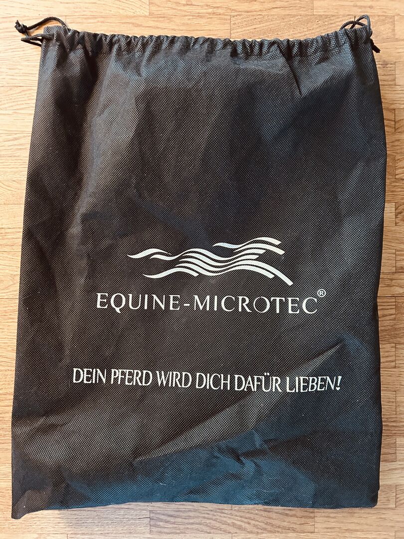 Equine-Microtec gaiters dressage black - Set of 2 fetlock boots with perforated neoprene lining and super-practical quick-release fastener. Very good, used condition. No defects. Washable at 30 degrees. Size: Full (warmblood) Dust bag included.