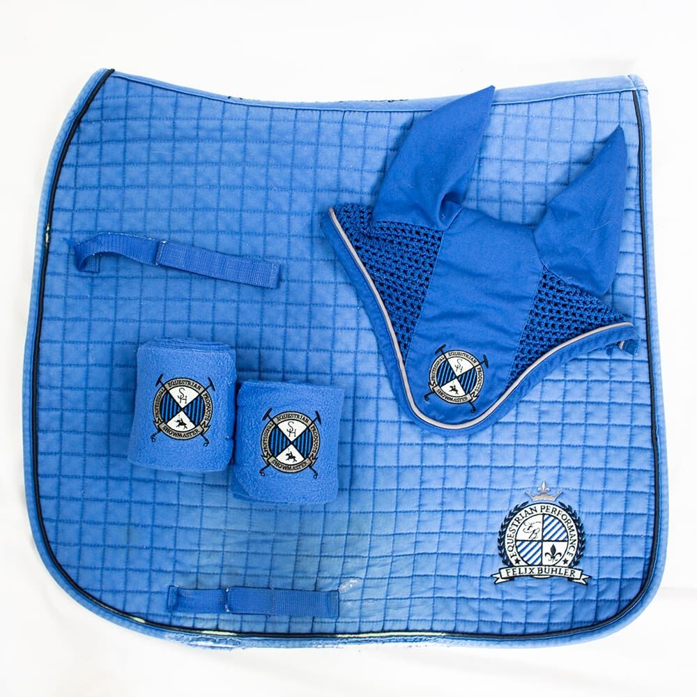 Felix Bühler Saddle Pad blue DR - A beautiful dressage saddle pad from the company Felix Bühler. The beautiful training saddle pad has a blue color. It has a small quilting and in the corner the beautiful Felix Bühler logo. Also we have the matching bandages and the matching fly hood in the store. The saddle pad has heavier signs of use. At the girth layer, the edge is unfortunately damaged and the color is somewhat faded. To the seller's offerlaunch