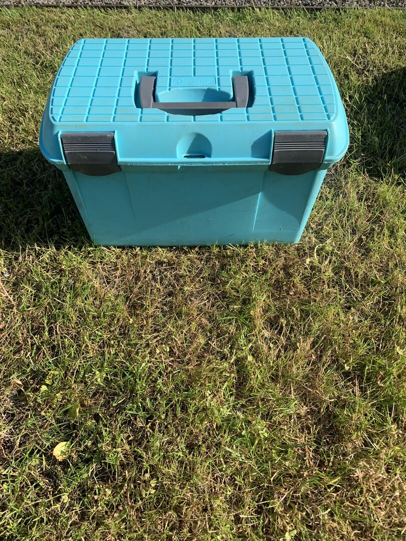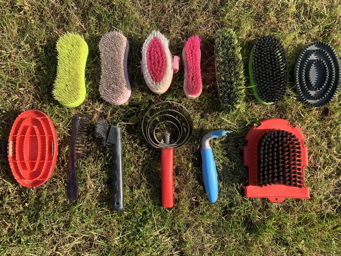 Grooming box with curry comb - Grooming box with various currycombs (hoof scraper, coat change currycomb and washing brush with two different sides are also included)