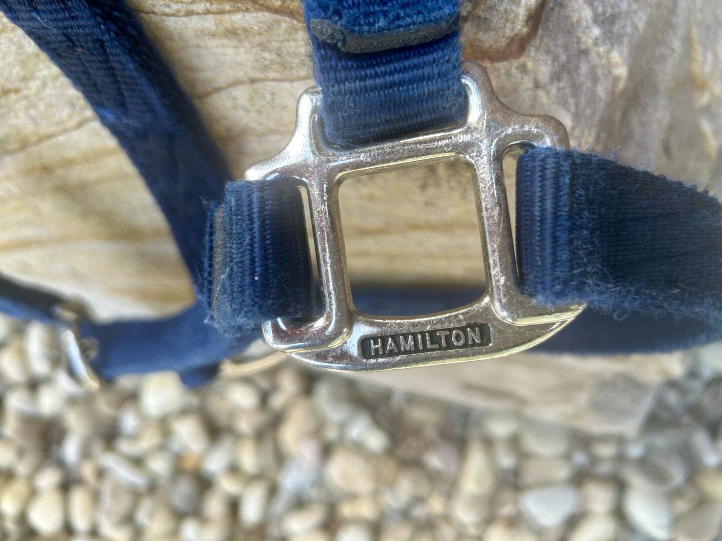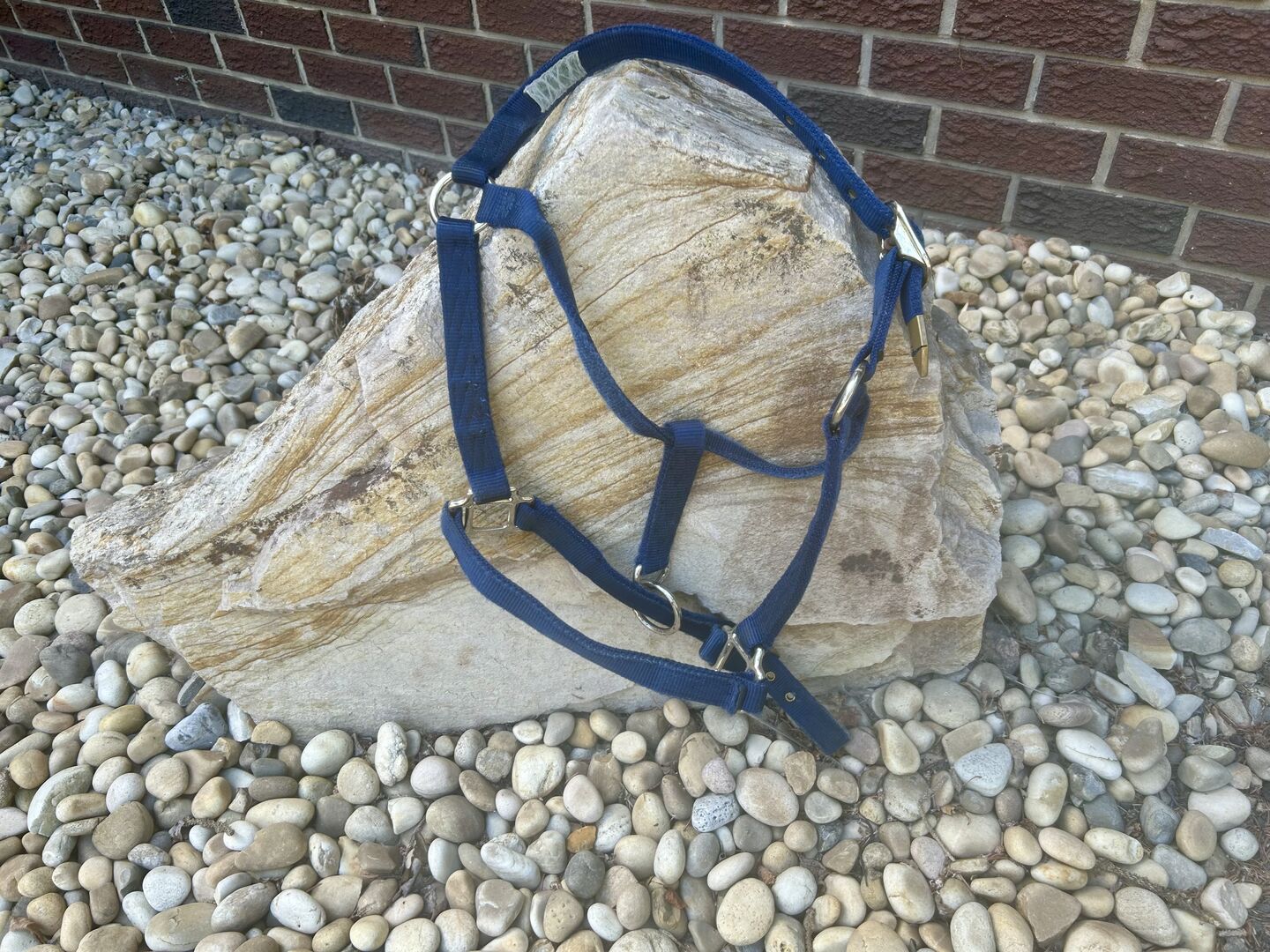 This navy blue nylon Hamilton halter is in good condition, although it has some signs of wear. Full size 1” Brass hardware Adjustable nose band