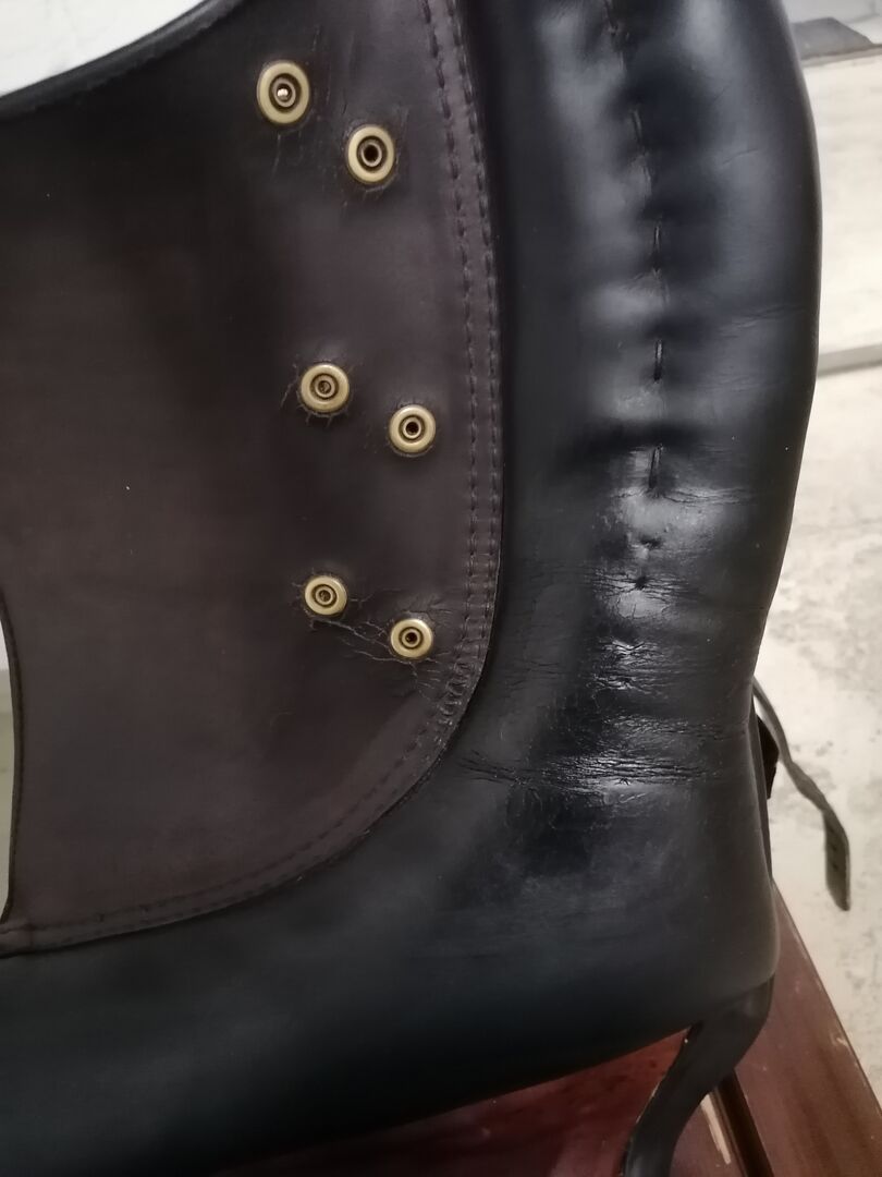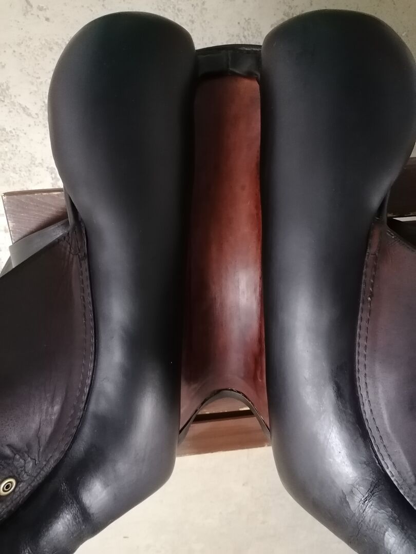 The saddle is old, but was always renewed in parts. The seat, for example, has been renewed with wonderfully grippy but comfortable leather. In addition, the spinal canal has been widened to make it comfortable for the horse. The saddle was freshly padded (of course also nice and soft) and then only used for about 2 months. Only two decorative buttons are missing and the leather is cracked on the underside. Here it needs regular care. This was unfortunately neglected by the previous owner, but has never bothered me.