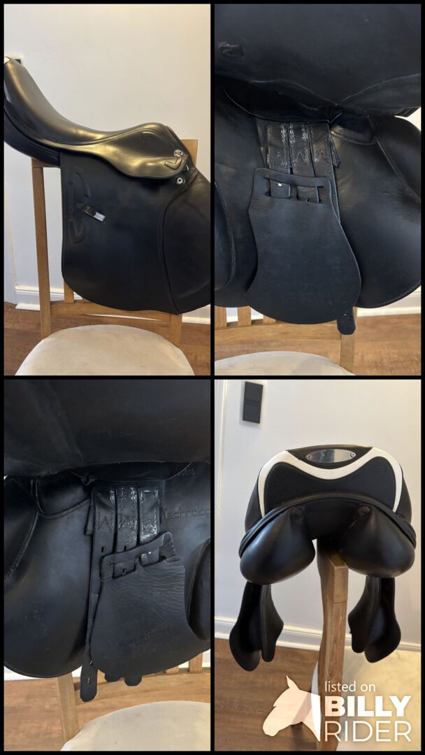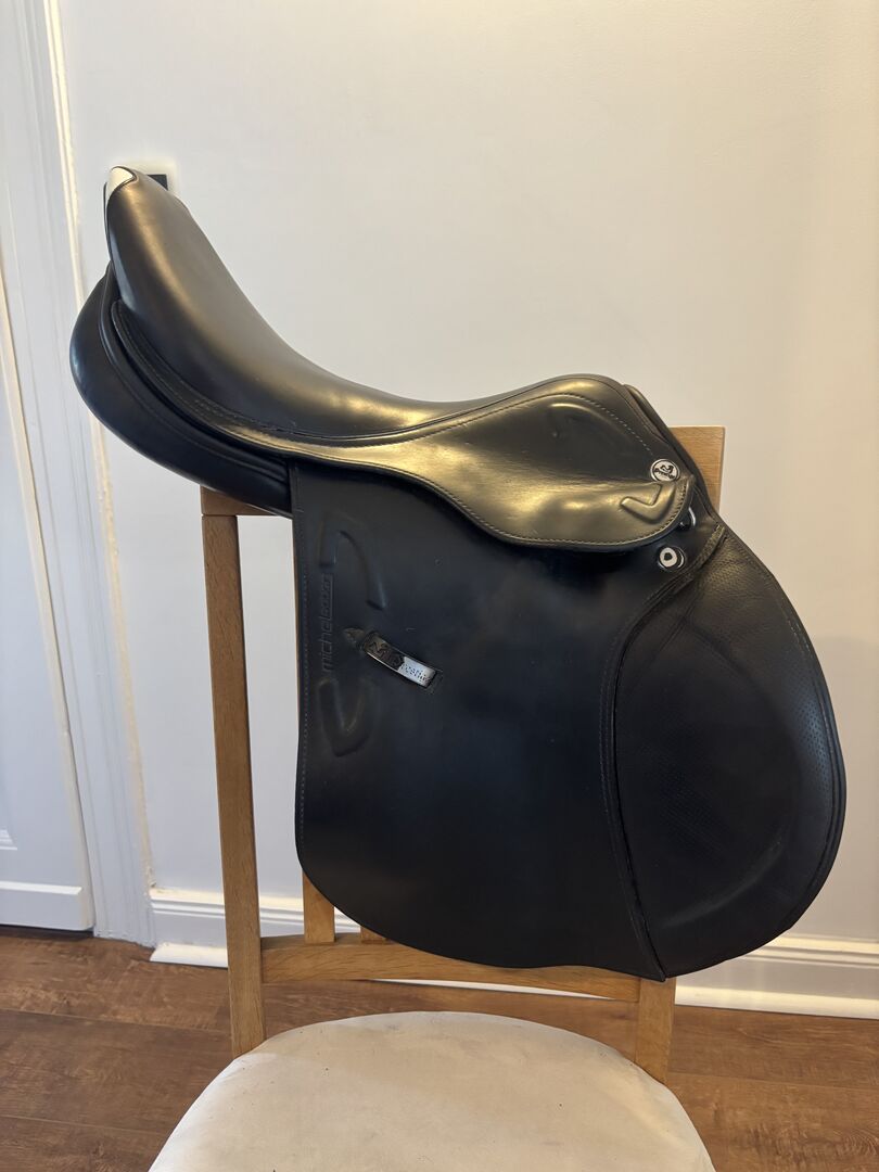 Jumping saddle Michel Robert Prestige - The saddle has a 17 mm seat and a 33 mm chamber. It is sold with a saddle pad. It has normal signs of use. On one side the metal plate on the strap for the stirrup leathers is missing. This saddle stands out due to its design. The most important features are the narrow waist for more closeness to the horse and a very deep seat, as well as the narrow waist and the deepest points further back in the seat, which allow the rider to keep moving and have the horse in front of him. The anatomically shaped panels guarantee maximum freedom of movement for the trapezius muscles. The optimal support ensures freedom of movement for the horse and ensures that the saddle can also be used on horses with pronounced withers and strongly developed shoulders. The saddle has been well cared for when used. It has always been stored in a temperature-controlled tack room with saddle pads. The saddle features X-Technology. It is black with partially grained leather. The saddle has been regularly checked and padded by a saddler. The saddle is not available for trial. You are welcome to view it on site and/or bring your horse with you to put on the saddle. No test riding.