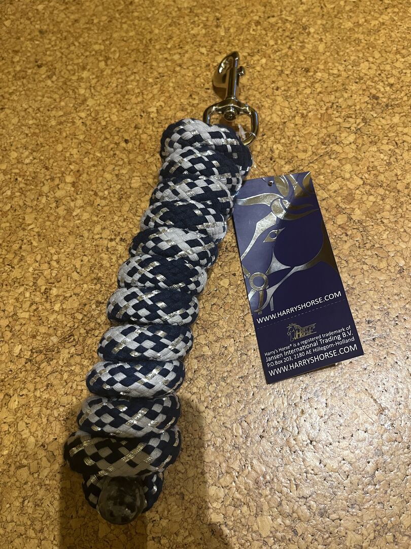 Lead rope, tethering rope, rope - I am selling a brand new, unused lead rope from the Harrys Horse brand. It has a silver carabiner and is navy/white (possibly also a very light gray) with a silver thread. 2m long. If you have any questions feel free to ask me, please have a look at my other items to save on shipping. Price plus shipping. Since private sale, no guarantee or return