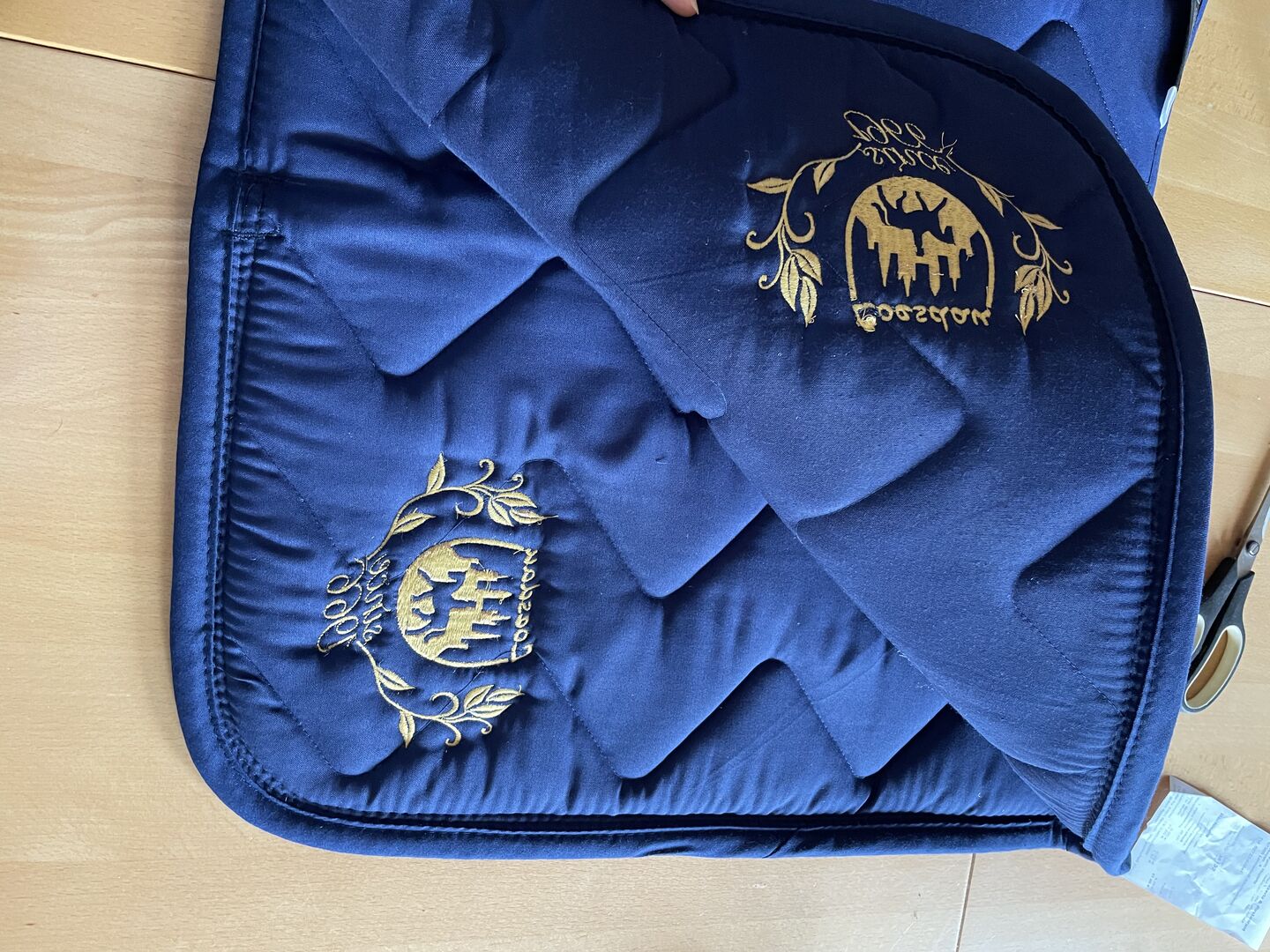 The saddle pad is new with price tag and has never been on the horse. Also not for fitting. I won it at a show and have no use for it.
