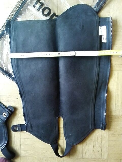 New leather chaps HORZE black size M adults H44/W34 - New genuine leather chaps made of soft cowhide leather with dressage bow, these high-quality chaps have a perfect fit! Height inside 44 cm, outside 47 cm, width unstretched 34 cm. The chaps are made from thick, soft leather with a brushed leather lining and have a tailored fit. The back has a YKK zipper and a stretch insert for freedom of movement and comfort. Unworn new condition with matching bag. Brand Horze, size M, adults Please refer to the pictures for detailed measurements. Non-smoking household, private sale, Paypal available. New price was 89,90 Euro.