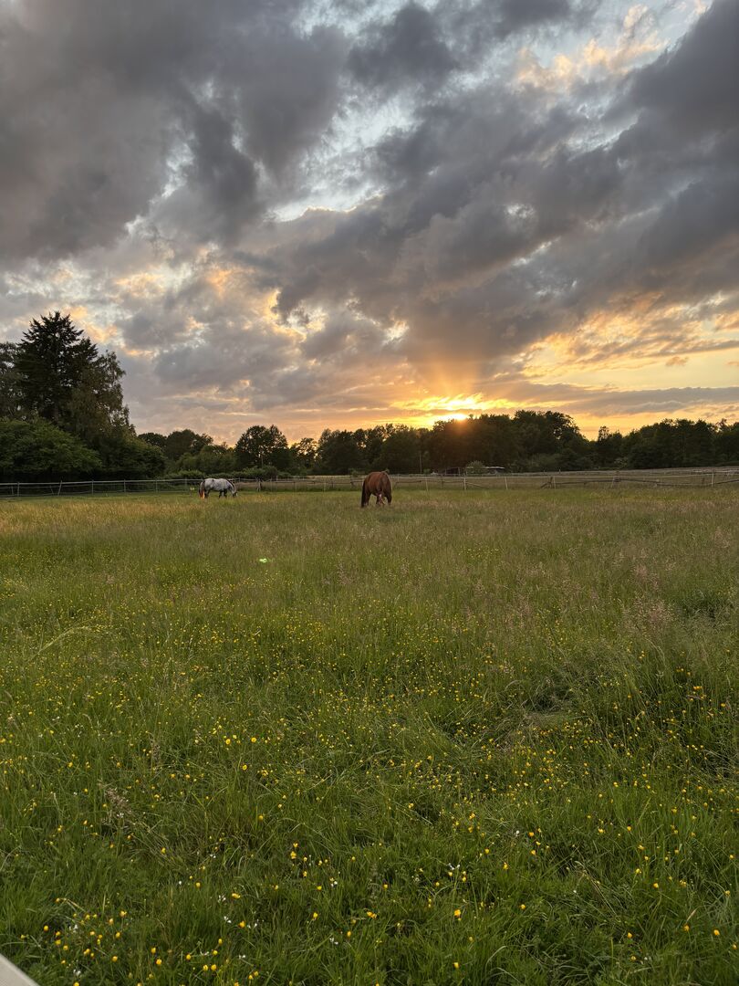 What awaits you and your horse: -Large paddock with long paths and adjacent trees -Large pasture areas with limited grazing all year round depending on the weather & season -Large shelter (2nd in planning) -Roofed & paved hay rack with limited access -Fresh water (supplied by the farmer) -Beautiful riding area & round pen (riding arena in planning) -Small tack room and a garage for tools with a small sitting area for people -1-2 services per week, available for an extra charge