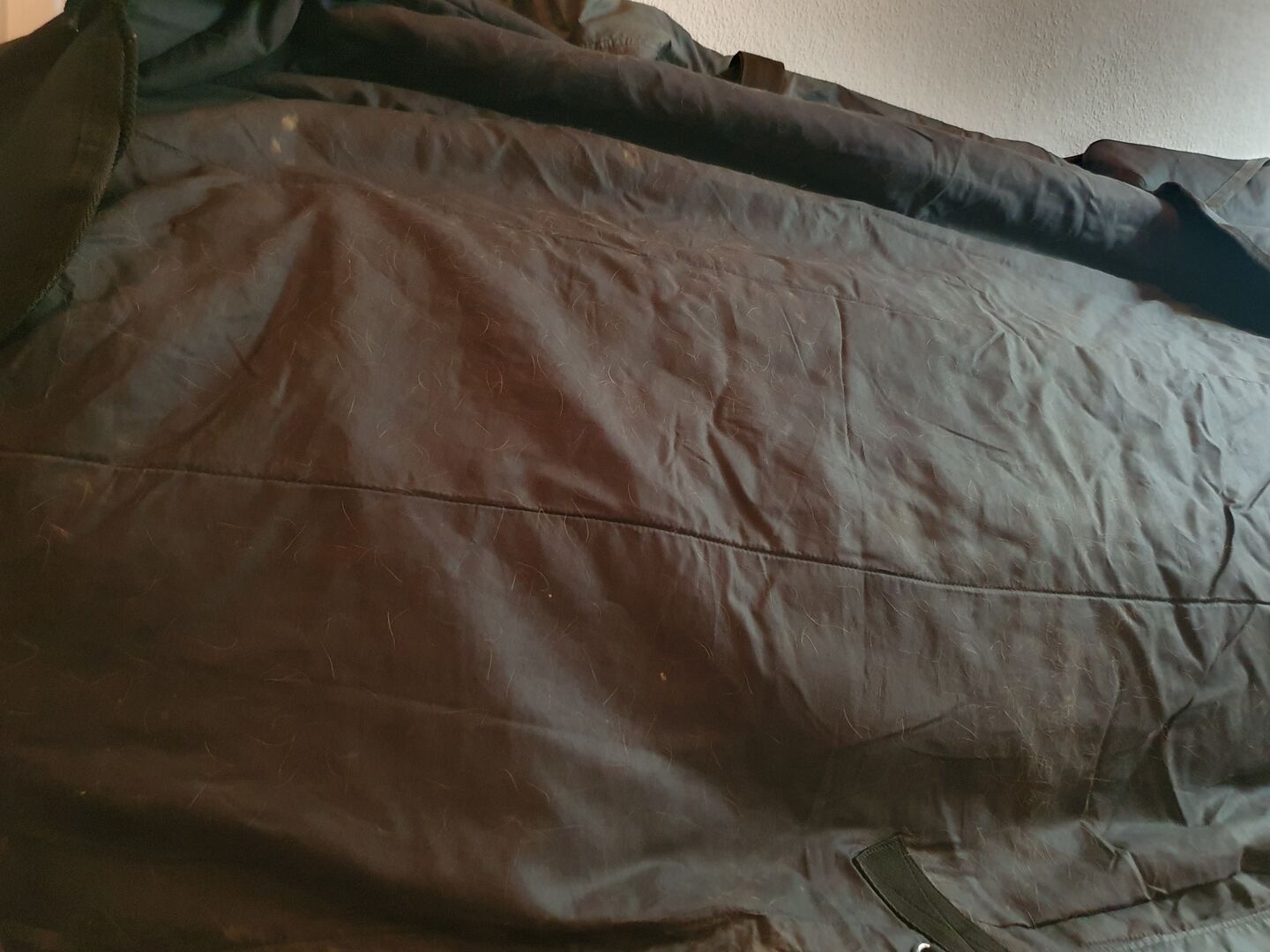 Outdoor/ rain blanket, 50gr, black, 135cm - Worn 2x in the open stable. No tears, no holes. Breathable, waterproof, windproof, cross surcingles, leg cords