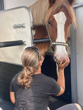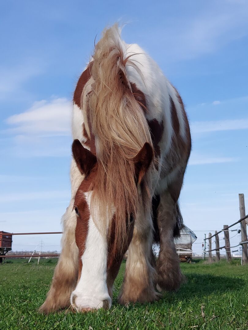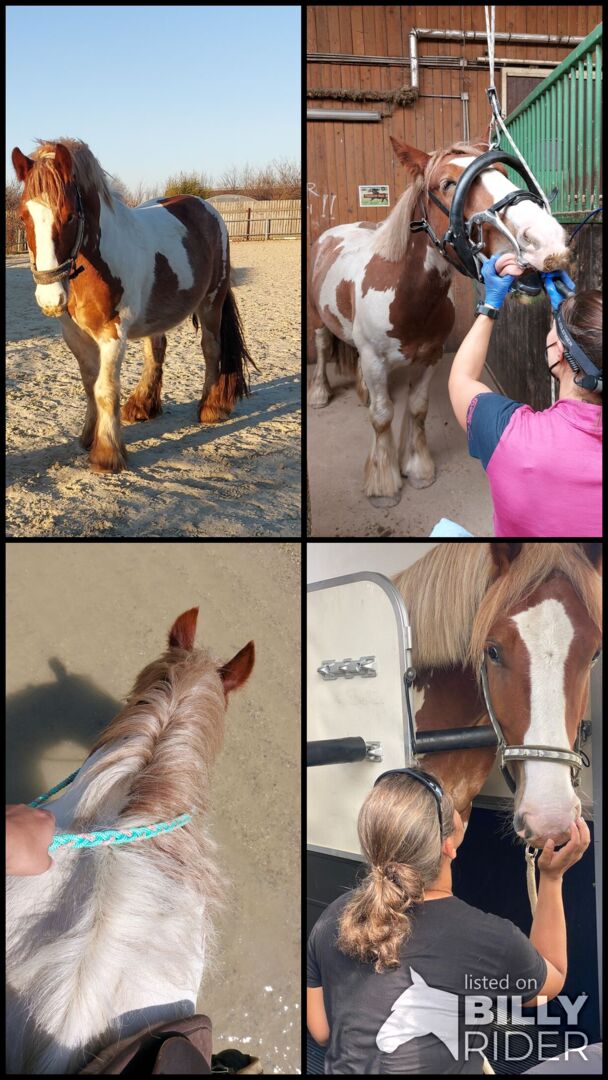 Farrier comes every 2 months to trim, Robbie is barehoofed, is always outside without a blanket even in winter. His teeth are done, he has been regularly vaccinated and wormed. Unfortunately, as can happen with Tinkers, he has one blemish: his stool. So far he has been on the trailer 3 times on his own, with additional trailer training in between. However, due to his inexperience and youth, loading should be done with sufficient empathy and patience.