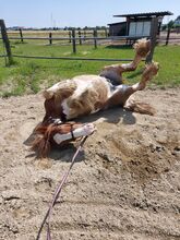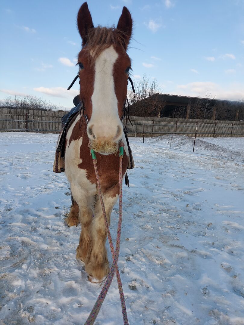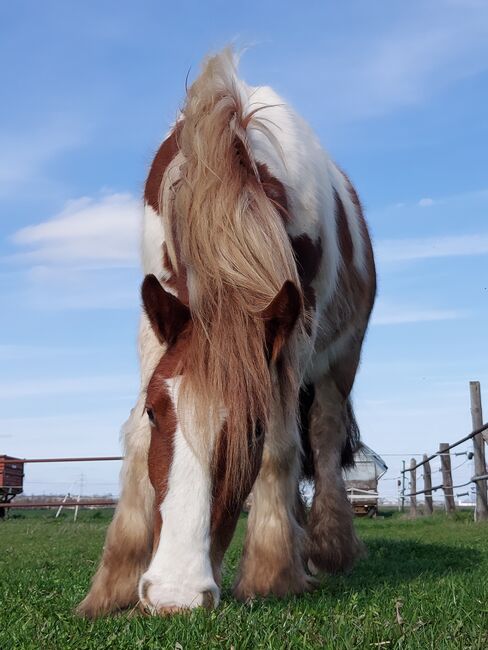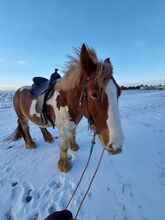 Playful Tinker gelding Robbie - Robbie (Rob Roy EG) is an Irish Tinker gelding born in April 2021 Weight and height were measured in early summer 2025 and were 553.5kg & 148cm He currently lives in a gelding herd in an open/active stable, with automatic hay feeding, which is very good for him. Before moving to his current stable, he was also in a mixed open stable herd where he fitted in without any problems. His rank is medium, he doesn't like to be pushed away, but he doesn't shoo anyone away either, he's just the chilled-out type. We have mainly lunged him in all gaits with or without a saddle, done pole work, ground work and clicker training. He is still growing and has therefore only been broken in carefully, mainly at a walk. However, he does this in the riding arena, in the hall and in the field. In 2025 he was fitted with a D&P Quantum Western saddle with a Western look, bridle with and without bit (mainly ridden without), bareback pad and other equipment is also available and will be given to Robbie.