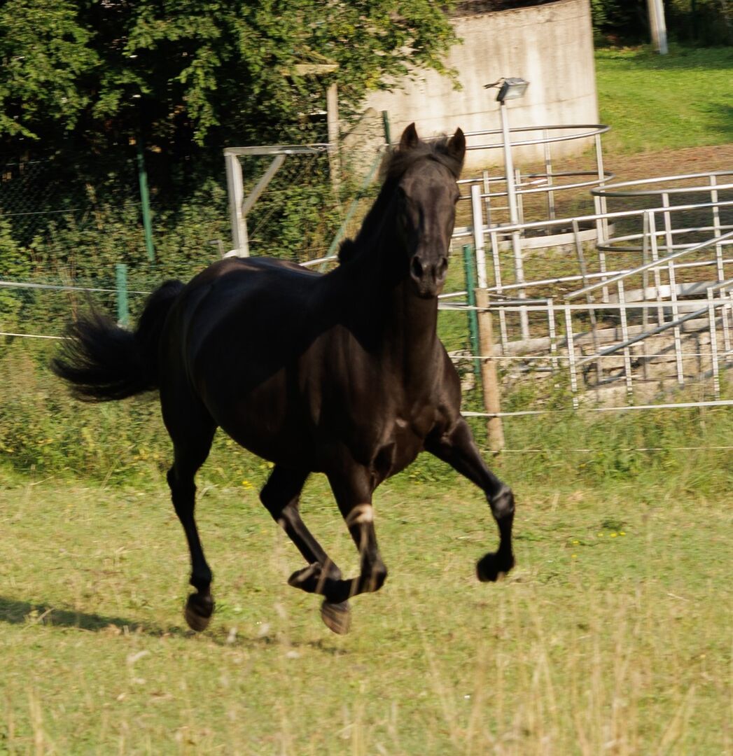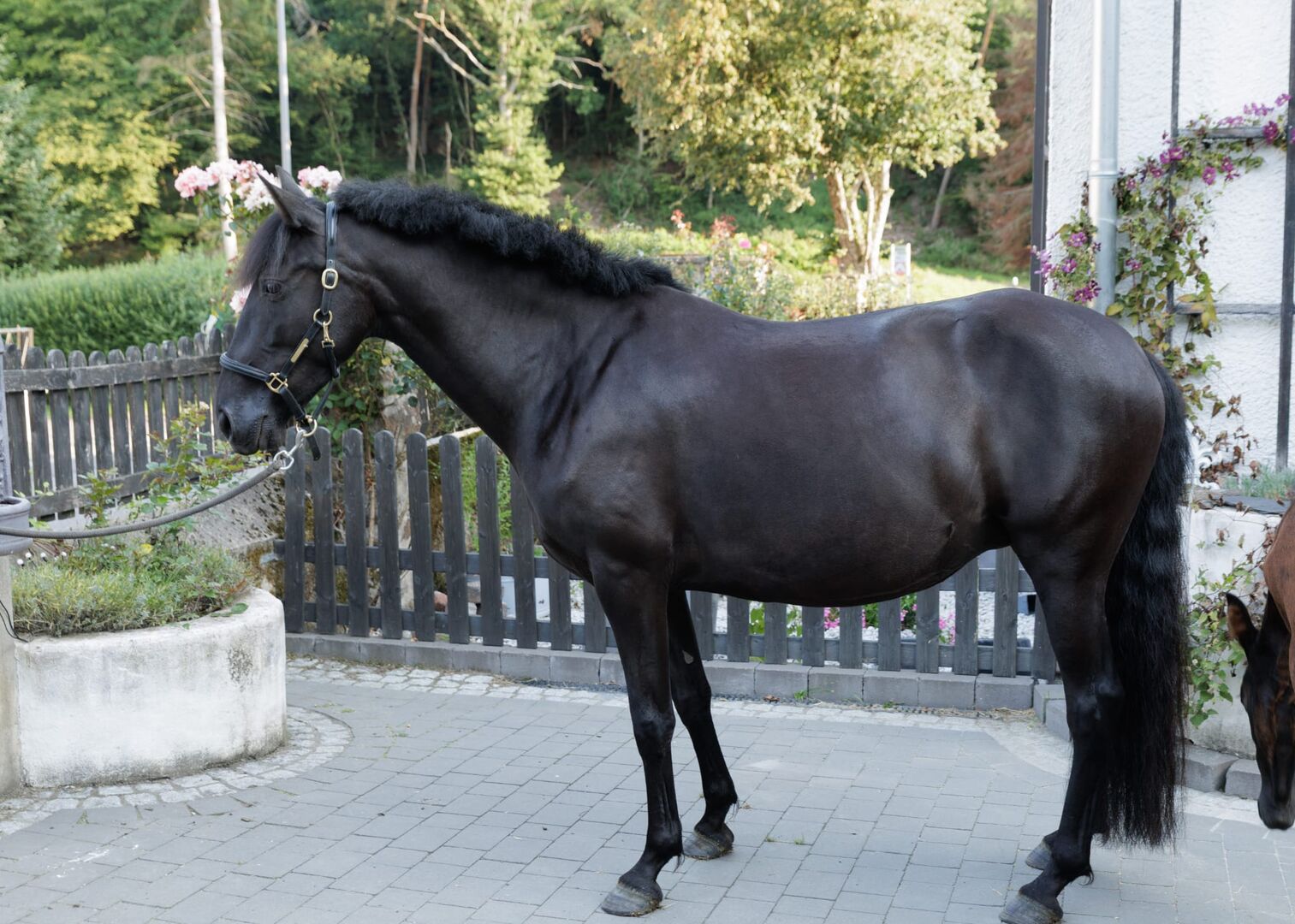 Pretty, pregnant black pearl (PRE) with good pedigree - Location: 54558 Winkel Acuarela - a beautiful Pura Raza Española mare, born in June 2019, with a height of approx. 158 cm. She presents herself in the elegant black color with a correct conformation, healthy constitution and an extremely lovely nature. Acuarela was imported from Spain three years ago by the renowned breeder Antonio Macias and used exclusively for breeding. She is halter-trained, knows open stabling and grazing and is always friendly, people-oriented and cuddly. She is uncomplicated in her daily handling, well-behaved at the vet, regularly wormed and vaccinated and has had her teeth done. The mare has already proven herself to be an excellent mother. So far she has given birth to two foals without any problems. Her first foal is particularly successful and is expected to be used as a stallion from next year. She currently has an outstanding colt by Ocalzo CEN at foot, who is also for sale. Acuarela is in foal for 2026 by the stallion Hampon XII. She is taller and brings baroque types with swinging movements suitable for dressage. Due to her pedigree and her previous foals, she is a real asset to any breeding program. With her balanced character, her open-mindedness and her flawless conformation, she offers the best prerequisites for further breeding. She is unspent as she has never been ridden before and is always well-behaved, friendly and sociable. Acuarela AMC is a PRE mare who impresses with her quality, appearance and breeding value.