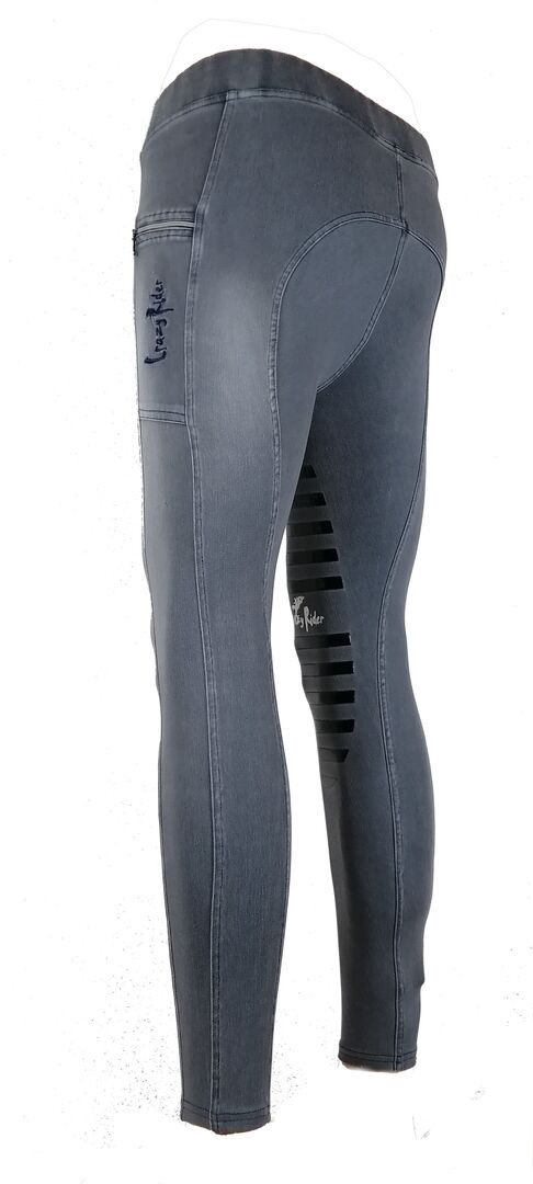 Riding leggings "Denim" with High Grip - Elegant high elastic riding leggings with 3/4 high grip trim made of silicone. Maximum riding comfort and best hold in the saddle you experience with our riding leggings " Performance". It makes every movement, stays in shape, dries quickly and is very easy to clean. 2 practical cell phone pockets High and wide waistband, no uncomfortable feeling and constriction on the abdomen. Quick drying, UPF 50 - sun protection Light compression effect 12-15mmHg Material: 80 % Polyamide, 20 % Elastane Flat seams - flat lock Controls blood pressure and contributes to muscle recovery.