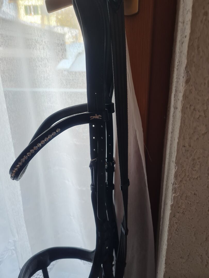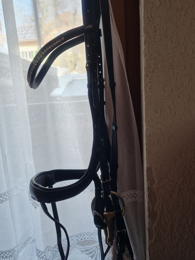 Schockemöhle Sports Snaffle EQUITUS BETA XL-WB black/silver - Snaffle as new, hardly used. (NP Eur 319,00 without reins) VK Eur 250,00 + reins Elegant anatomical special snaffle with new fit from Schockemöhle Sports. Curved noseband bypasses the main facial nerve. Softly padded headpiece with plenty of ear clearance. Curved browband decorated with large crystal chain with extra-wide fit to avoid pressure in the eye-ear area. Free breathing due to repositioned locking strap, Button rivets for individual adjustment. Further questions gladly by mail.