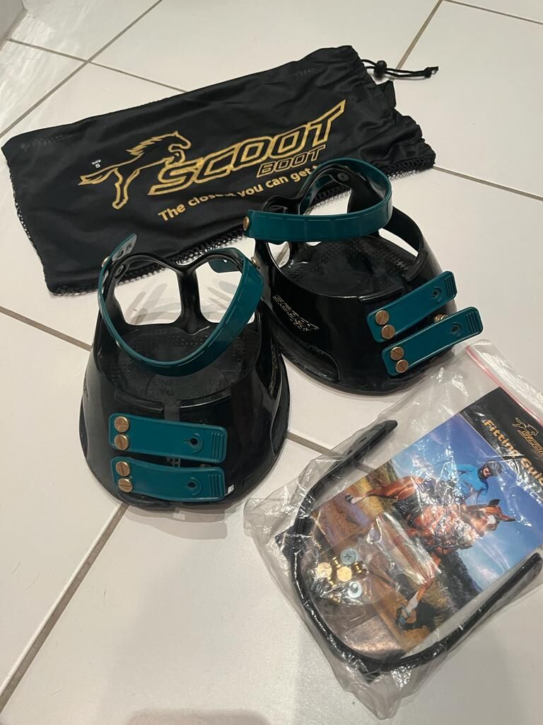 Scoot Boots Gr. 5 Chwarz o. Petrol as good as new Top condition - Top condition 1 pair, without defects Scoot Boots hoof shoes in size 5 with accessories with matching buckle straps (new price from 185 €) in black or petrol ready to go for sale as in the photos. Super comfortable, chic to look at, very proven, air permeable, water draining, top hoof shoes as a replacement for any horseshoes o. Glue shoes as protection or for sensitive horses hooves. Fixed price, will be sent with insured shipping or pickup in Berlin Westend. Hardly worn, because unfortunately too big.