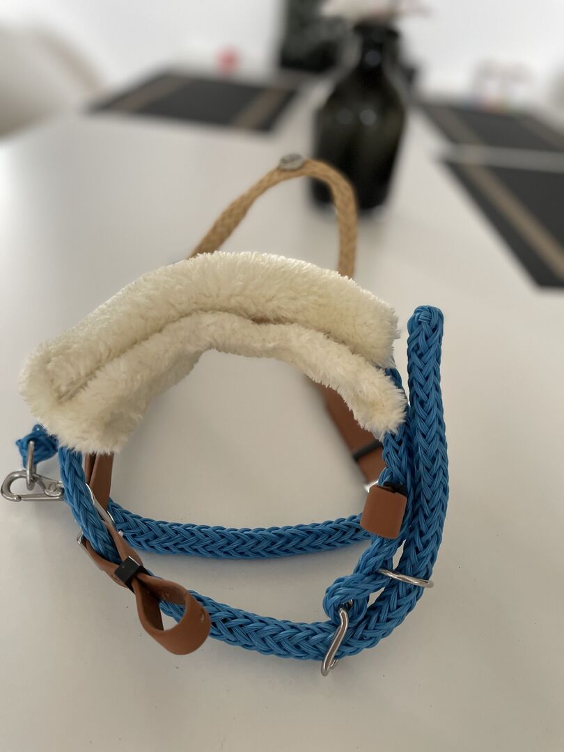 The colors of the bridle are beige, Biothane in brown and Seaplast blue.