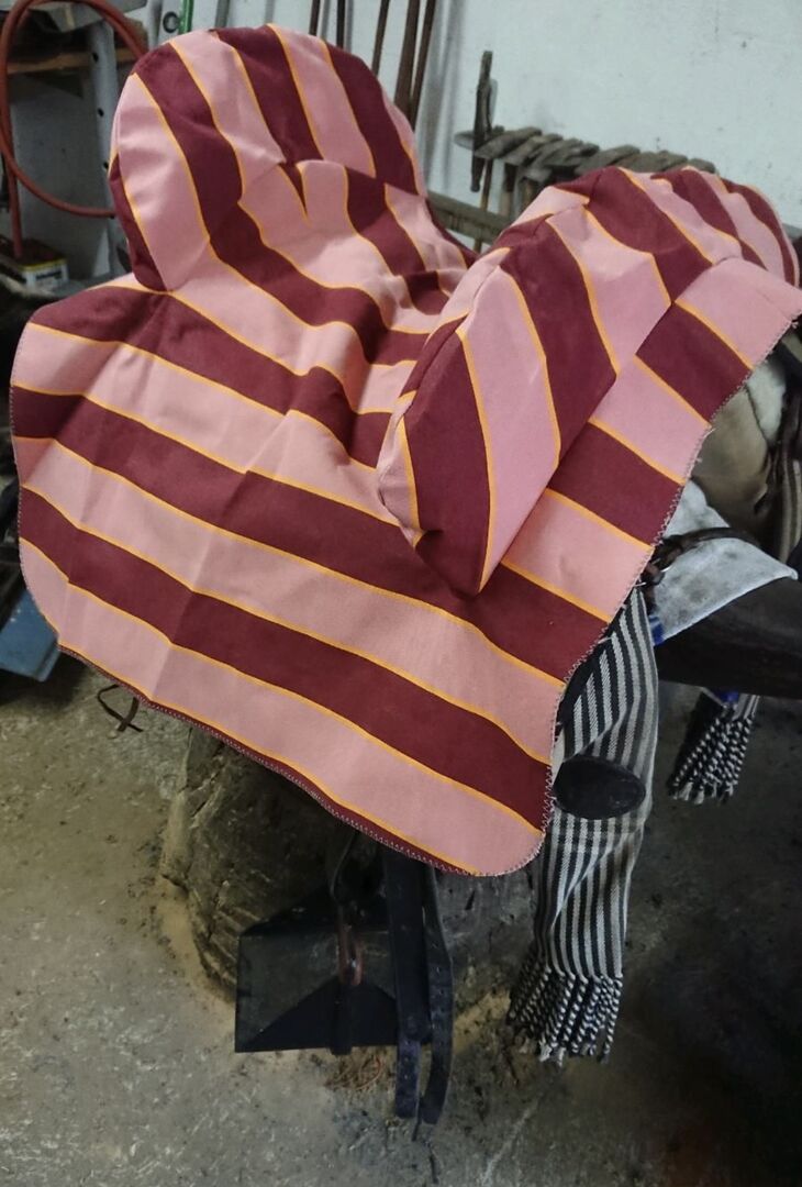 The saddle has a small tear at one seam. See picture. However, this is at the bottom of the girth and shows no restriction. I had it on a Noriker