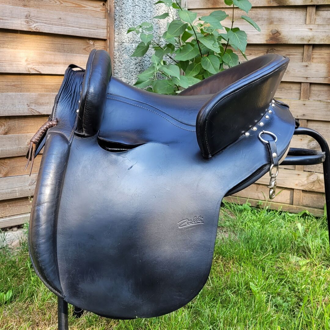 Zaldi Mixta Spanish saddle - Used Spanish brand saddle for sale from the Zaldi company, also popular in Germany. Model Mixta, serial number 994396 with normal 14 inch seat (western size, corresponds to ladies' trouser size 36-40), approx. 36cm space between the galleries. Color is black. Chamber width narrow-medium. Total length approx. 48cm, contact area approx. 45cm. Saddle flap length from cantle approx. 32cm. Thigh clearance between the galleries approx. 20cm. Fitted on normal 142cm Camargue.